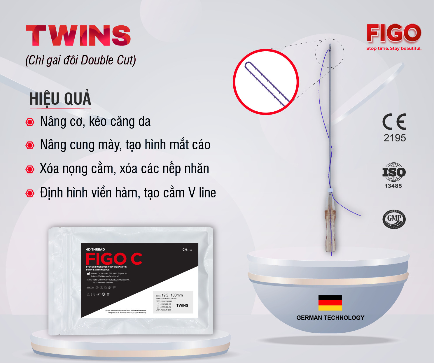 Twins 21G hỗ trợ các vùng cơ bị chảy sệ vùng ngắn, mỏng, hỗ trợ nâng nọng cằm, xoá rãnh Marionette, nâng cung mày, tạo hình mắt FOX EYES, DOVE EYES, CAT EYES